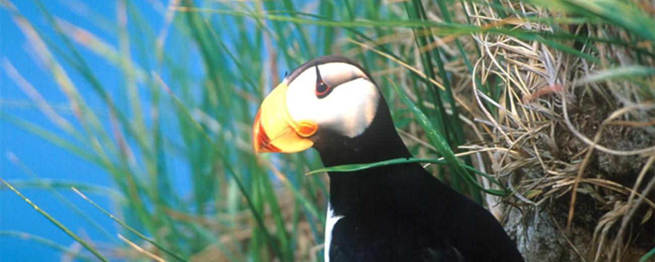 More than 100 bird species can be found in this area, and some are unique to the Aleutian Chain. One of the rarest birds in the U.S. is the whiskered auklet, a small, gray diving seabird with white whiskers. It nests only in the Aleutians, particularly at the eastern end of Unalaska Island and in the nearby Baby Islands.